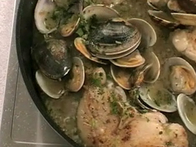 Рецепт приготовления рыбы.Состав:хек, моллюски, петрушка, масло, чеснок, белое вино, мука.